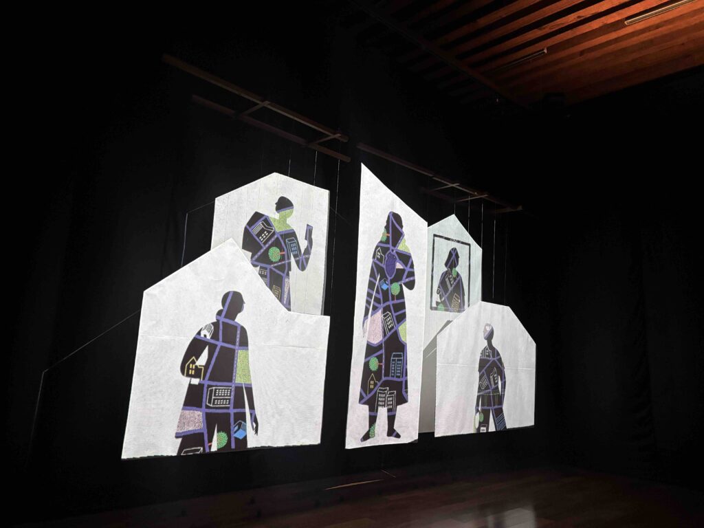El corazón visual de La Ciudad del Ahorro es una instalación de cinco lienzos de papel japonés, suspendidos sobre un bastidor de madera de cedro ensamblado con técnicas tradicionales japonesas. Cada lienzo, con formas geométricas distintas, evoca la silueta de una ciudad en movimiento. Los elementos se distribuyen en dos planos, generando profundidad y permitiendo que la luz se difunda de manera sutil entre capas.