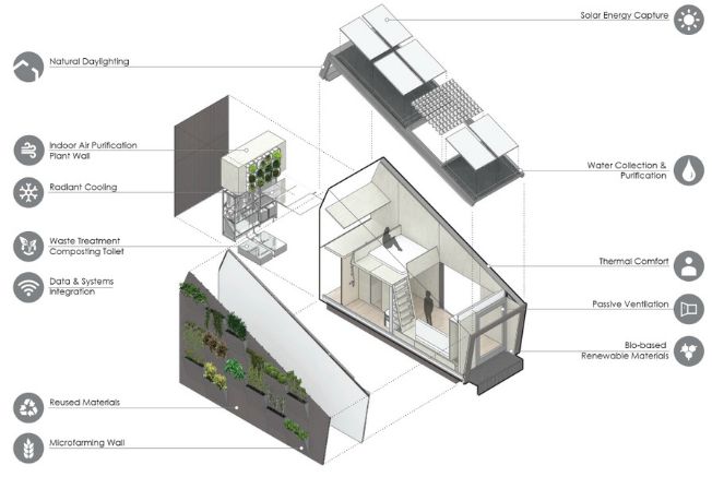 Este modelo para casa sustentable tiene un jardín vertical que sirve para practicar la microagricultura y es regado por el sistema de aguas grises del inmueble. Su cosecha puede llegar a dar un 65% de porciones de frutas y vegetales con alto contenido de nutrientes al año.