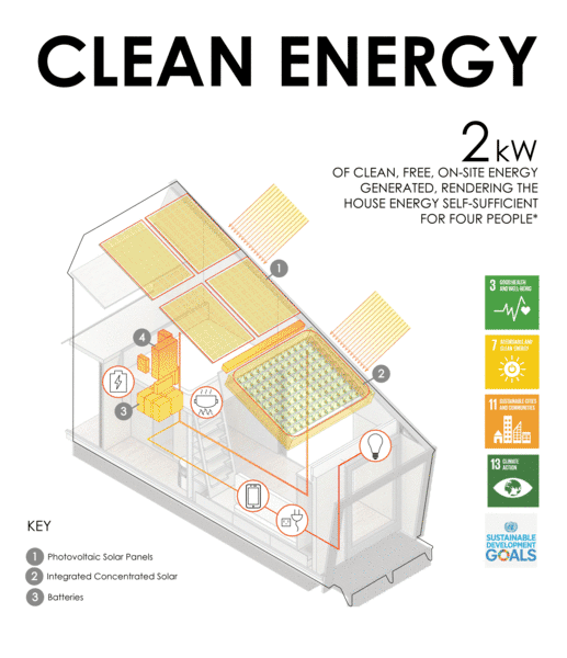 Por medio de paneles y baterías solares, el Módulo de Vivienda Ecológica produce alrededor de 2 kW de energía limpia y local que puede satisfacer las necesidades de cuatro personas. Además, aprovecha la luz natural al máximo para ahorrar el consumo energético.