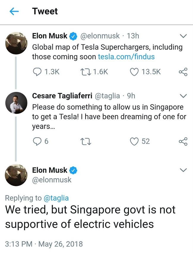 Elon Musk lanzó un golpe a las credenciales ecológicas de Singapur cuando un fanático de Tesla le suplicó al director ejecutivo de la compañía que trajera los vehículos eléctricos a la ciudad-estado. Musk expuso públicamente al gobierno de Singapur de “no apoyar” los vehículos eléctricos.