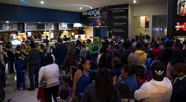 Para ayudar con los preparativos y recibir a los niños que van por primera vez al cine, se reunieron varios voluntarios de Fundación Cinépolis, el corporativo y la agencia El Recreo en punto de las ocho de la mañana en la plaza comercial.