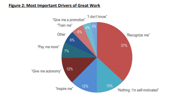La encuesta se desarrolló utilizando preguntas abiertas y sin ayuda para garantizar resultados imparciales y precisos. Para comenzar, a los encuestados se les formuló una pregunta abierta, “¿Qué es lo más importante que su gerente o compañía actualmente hace (o podría hacer) que te haría producir un gran trabajo?”