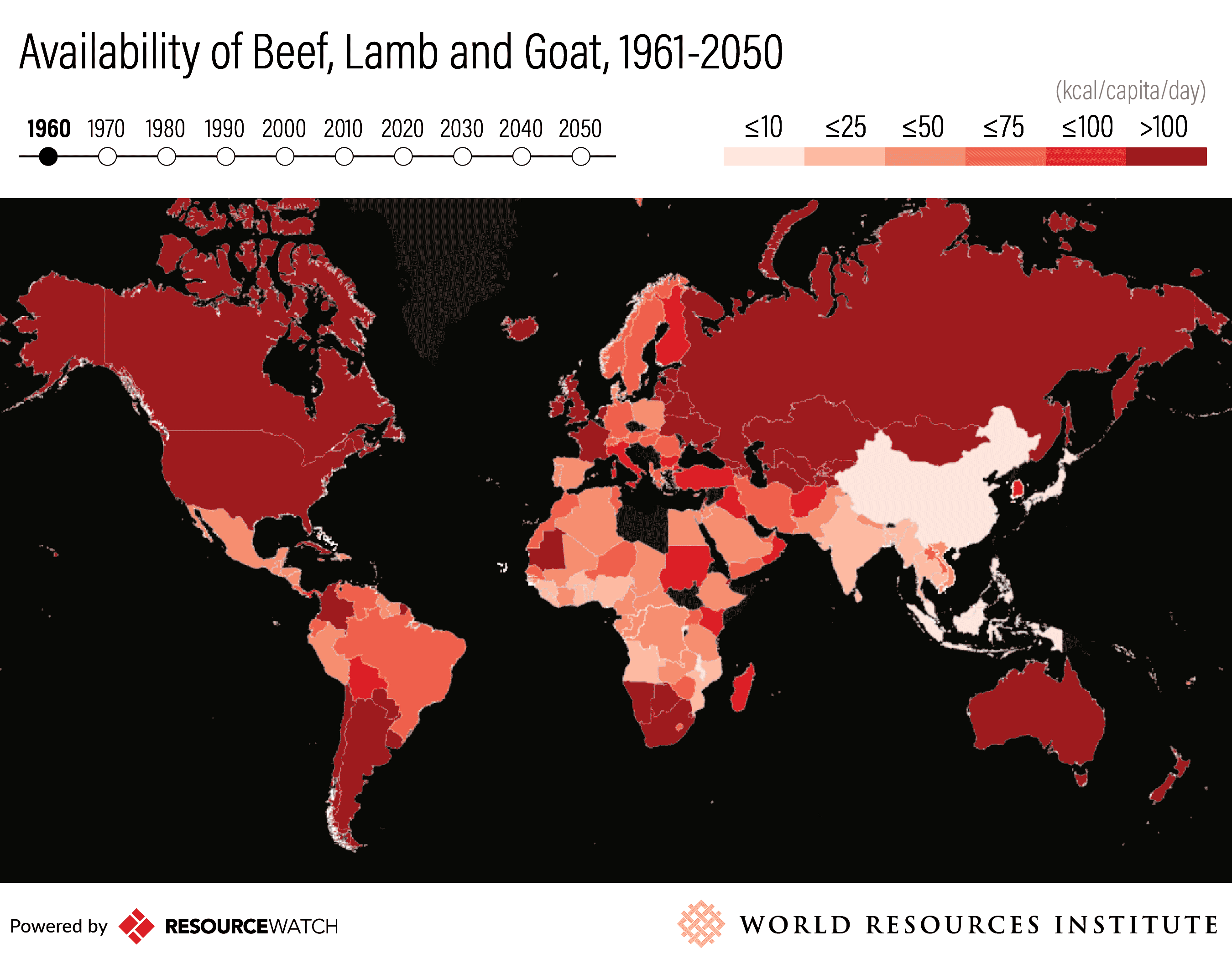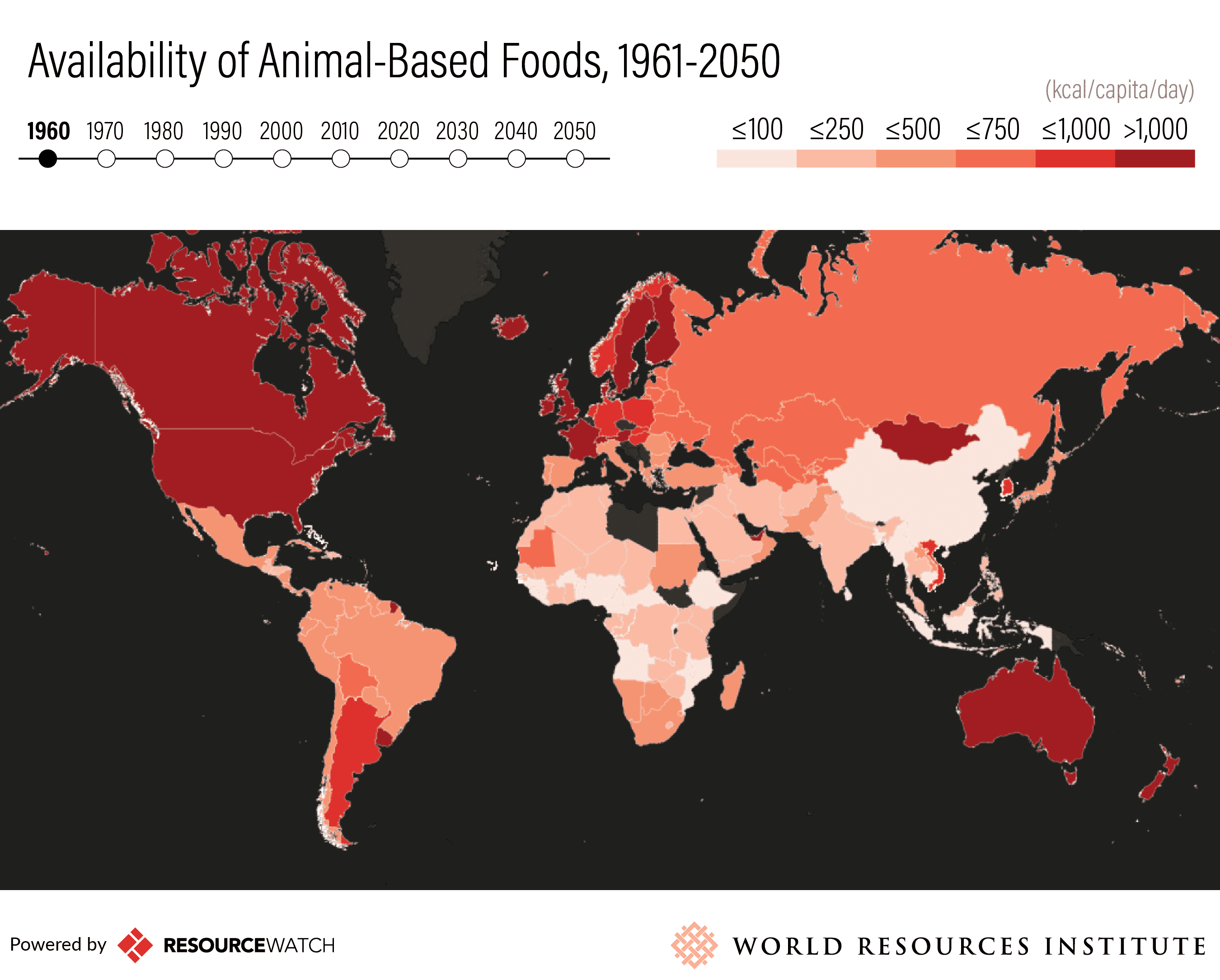 Se espera que la población mundial crezca hasta los 10 mil millones de personas para 2050, y si las tendencias actuales se mantienen, se espera que el consumo de carne aumente al mismo tiempo. WRI trazaron un mapa de las tendencias en el consumo de alimentos de origen animal desde 1961 y las extrapolaron a 2050 y las personas en 2050 probablemente comerán 70% más de carne y productos lácteos, y 80% más de carne.