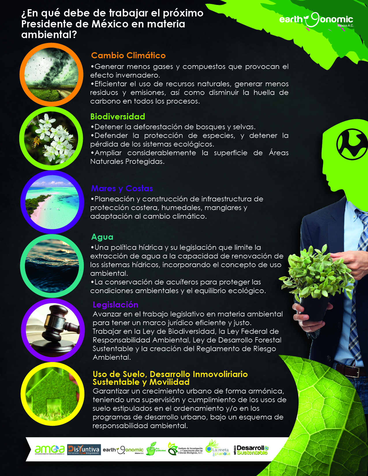 Earthgonomic México, Asociación Civil enfocada en el fomento de la protección al ambiente, la preservación y restauración del equilibrio ecológico, en conjunto con el Instituto de Investigación y Capacitación para las Ciencias Biológicas (IICCB), la Asociación de Medios de Comunicación Ambiental, La Meta del Planeta, Disyuntiva TV, Eco-Publicidad y México Desarrollo Sustentable, firmaron una declaración respecto a su visión de política ambiental de cara a las próximas elecciones para Presidente en el país.