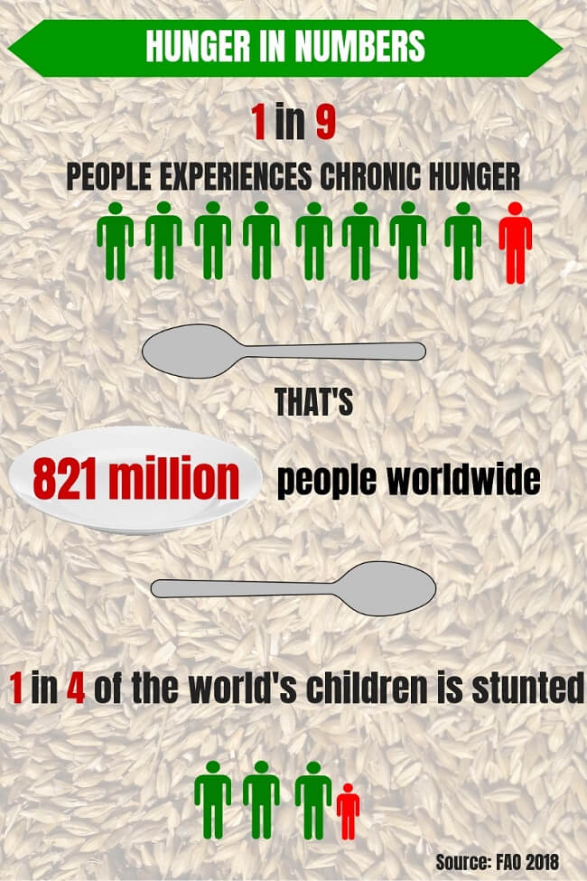 Por tercer año consecutivo, hubo un aumento en la población que padecía hambre en 2018. Según la ONU, 1 de cada 9 personas sufre hambre crónica, lo que puede tener efectos nocivos en el desarrollo físico y cognitivo de los niños, la salud reproductiva de las mujeres y las comunidades, seguridad y vitalidad económica.