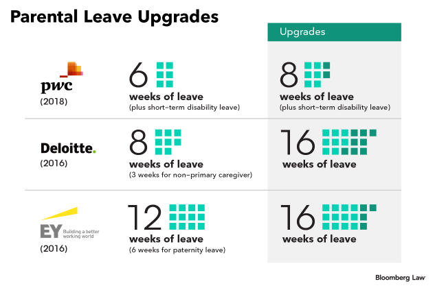 Actualmente, EY ofrece 16 semanas de licencia totalmente pagada para sus empleados de los Estados Unidos. Tanto para padres biológicos como para padres adoptivos. American Express ofrece 20 semanas para madres y padres, con seis semanas adicionales para madres que han dado a luz y requieren licencia médica.
