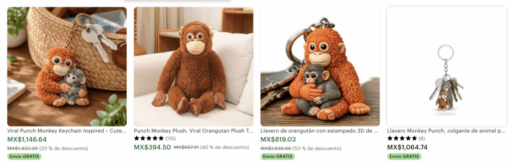 El caso de Punch también expuso cómo funciona la economía emocional en la era digital. Cuando su historia alcanzó notoriedad global, comenzaron a aparecer productos inspirados en el pequeño macaco en plataformas de comercio electrónico como Etsy: juguetes, camisetas, libros infantiles y mercancía personalizada basada en su imagen y narrativa.