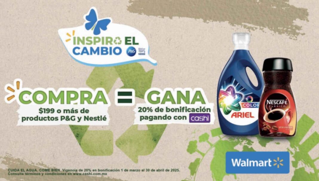 - Compra productos de Nestlé y P&G en Walmart: Al realizar una compra mayor a $250 en productos de estas marcas, los clientes recibirán el 20% de su compra en dinero Cashi.