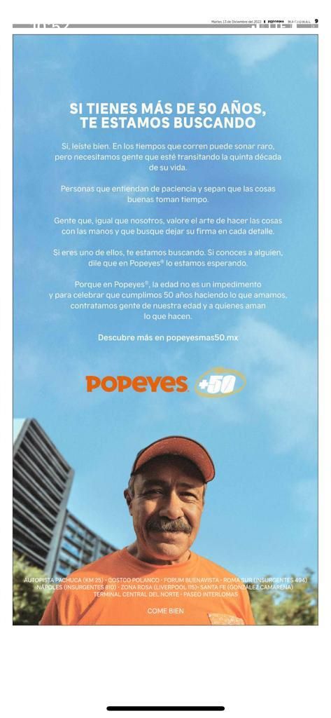 Si al igual que Popeyes cumples 50 años o más y sabes hacer las cosas con amor, Popeyes estará encantado de unirte a su equipo de trabajo, pero si además amas el pollo frito, no importa tu edad, amarás trabajar en este restaurante joven en México pero con 50 años en el mundo, conoce más acerca de las oportunidades laborales en www.popeyesmas50.mx