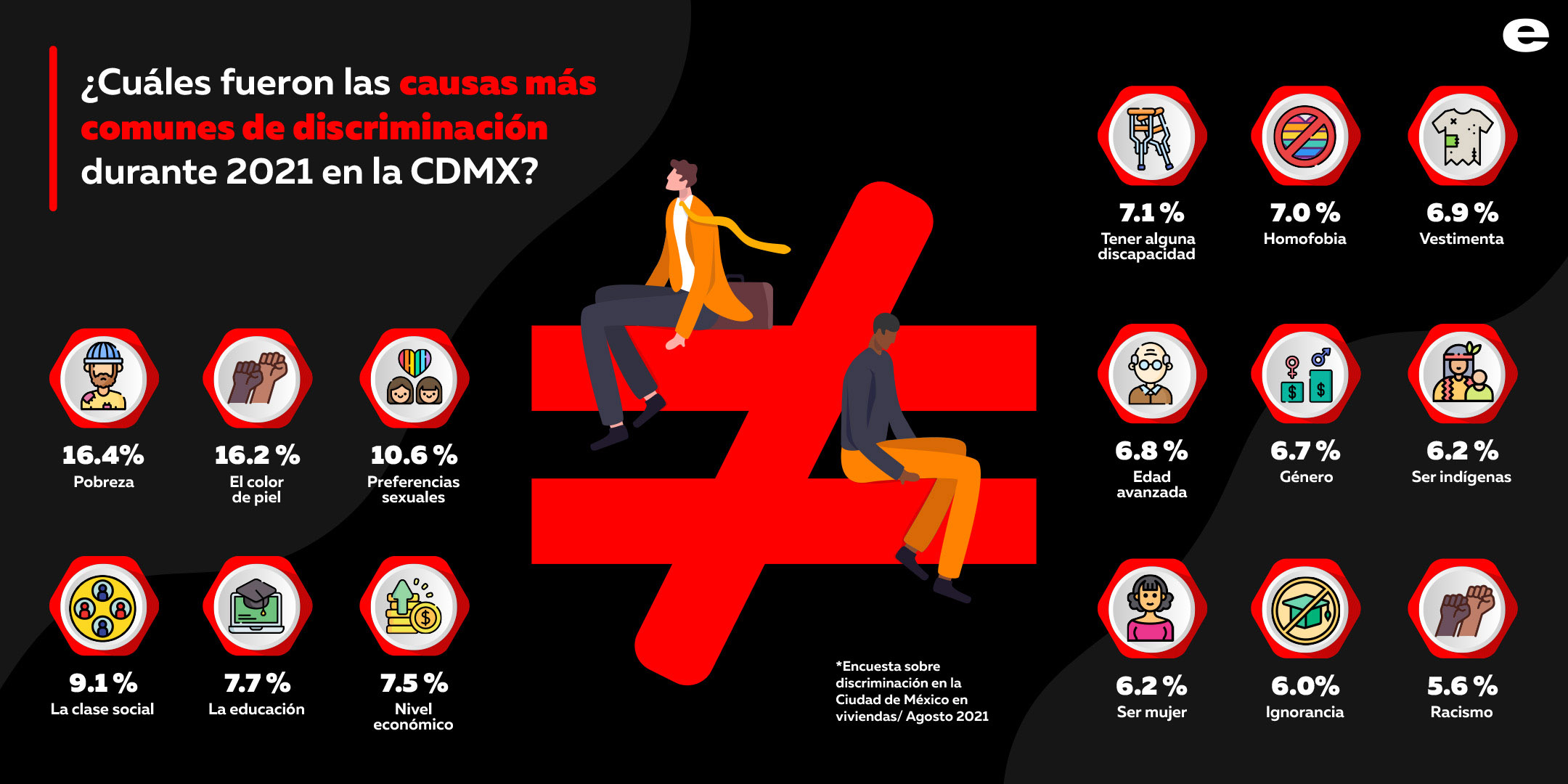 El acto de discriminar consiste en dar un trato desfavorable e injusto a otra persona o grupo, generalmente por su origen, identidad o forma de vida. Durante 2021, el COPRED (Consejo para Prevenir y Eliminar la Discriminación de la Ciudad de México) realizó una encuesta en la cual se les preguntó a los habitantes de la Ciudad de México: ¿Por qué discriminan en la CDMX?
