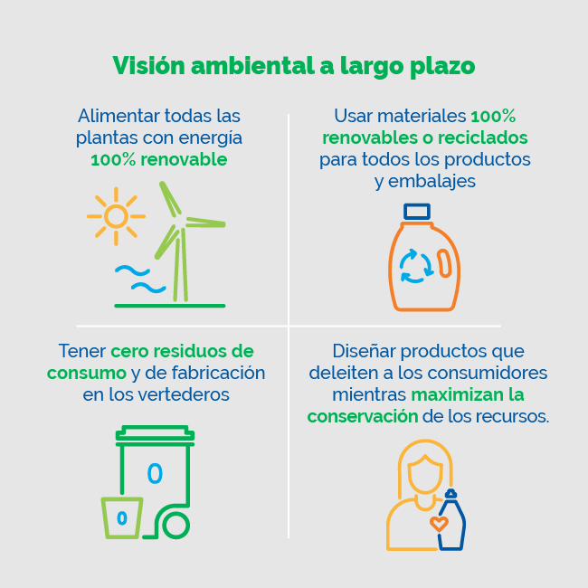 P&G reducirá las emisiones de gases de efecto invernadero (GEI) a la mitad en sus plantas de fabricación y comprará suficiente electricidad renovable para alimentar el 100% de sus plantas. La compañía también obtendrá al menos cinco mil millones de litros de agua de fuentes circulares.