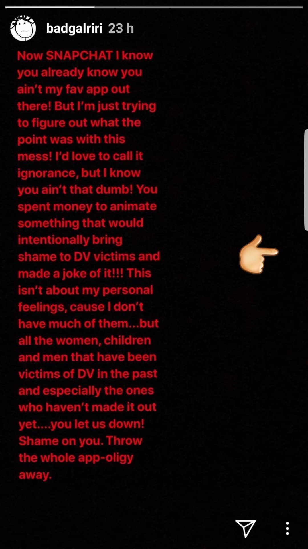 Tras el reciente caso de racismo en los GIFs dentro de las historias de Instagram y Snapchat donde se suspendió el uso de ellos en esas redes sociales, ahora Rihanna, la estrella del pop ha recomendado a todos sus seguidores que quiten de su celular la aplicación Snapchat después de que ésta publicara un anuncio burlándose de su paliza de 2009 a manos del entonces novio Chris Brown. Cabe mencionar que en 2009 el rapero fue condenado por abuso doméstico contra la cantante durante el tiempo en el que ambos fueron pareja.