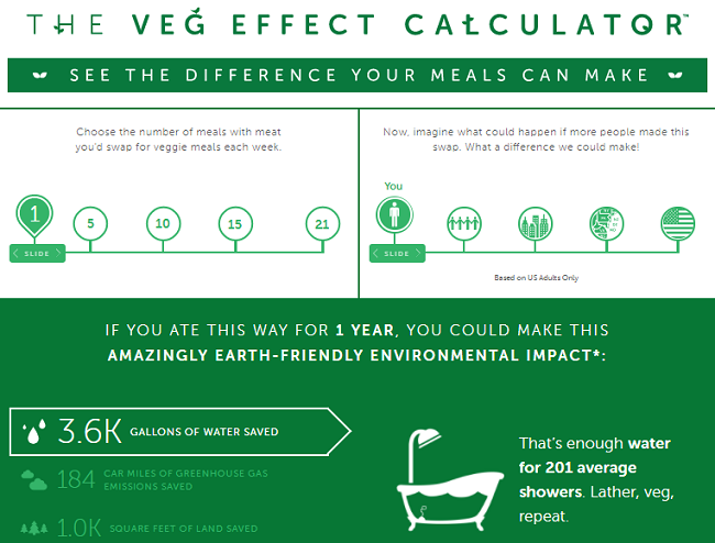 Una herramienta similar fue lanzada el año pasado por MorningStar Farms y el World Resources Institute (WRI), coincidiendo con la publicación de datos que afirmaban que el estadounidense promedio podría reducir sus impactos ambientales relacionados con la dieta en casi la mitad simplemente comiendo menos carne y lácteos. Creado en asociación con Quantis, la calculadora Veg Effect ™ permite a las personas calcular cómo hacer pequeños cambios en la forma en que comen puede tener impactos ambientales significativos.