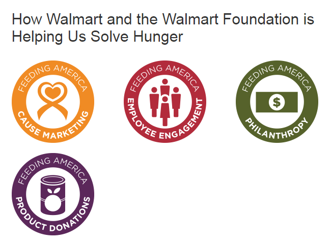 La responsabilidad social contra el hambre de Walmart y la Fundación Walmart han invertido más de 100 millones dólares en Feeding America desde 2005 para proporcionar comidas caritativas, infraestructura y otros programas.