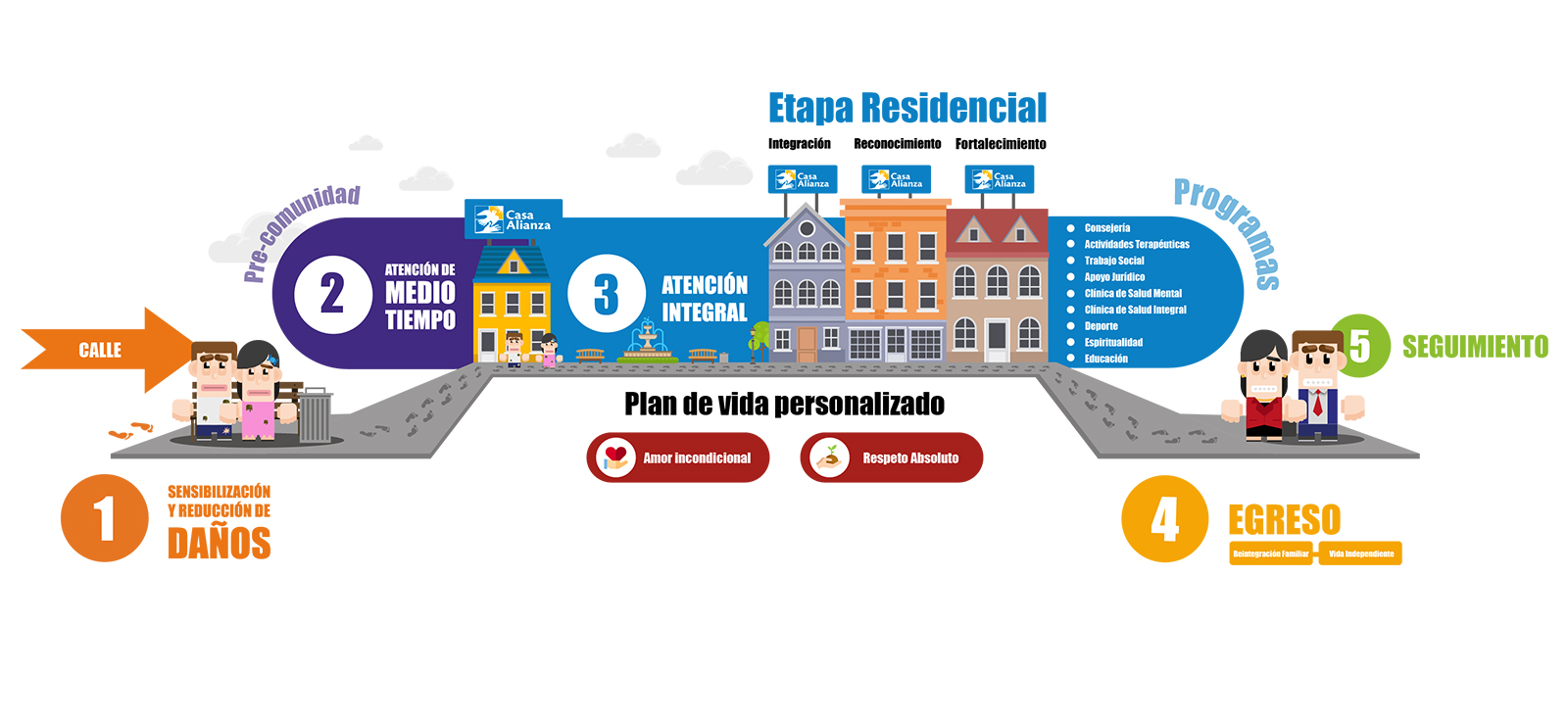 El modelo de atención de Casa Alianza se divide en cinco etapas: