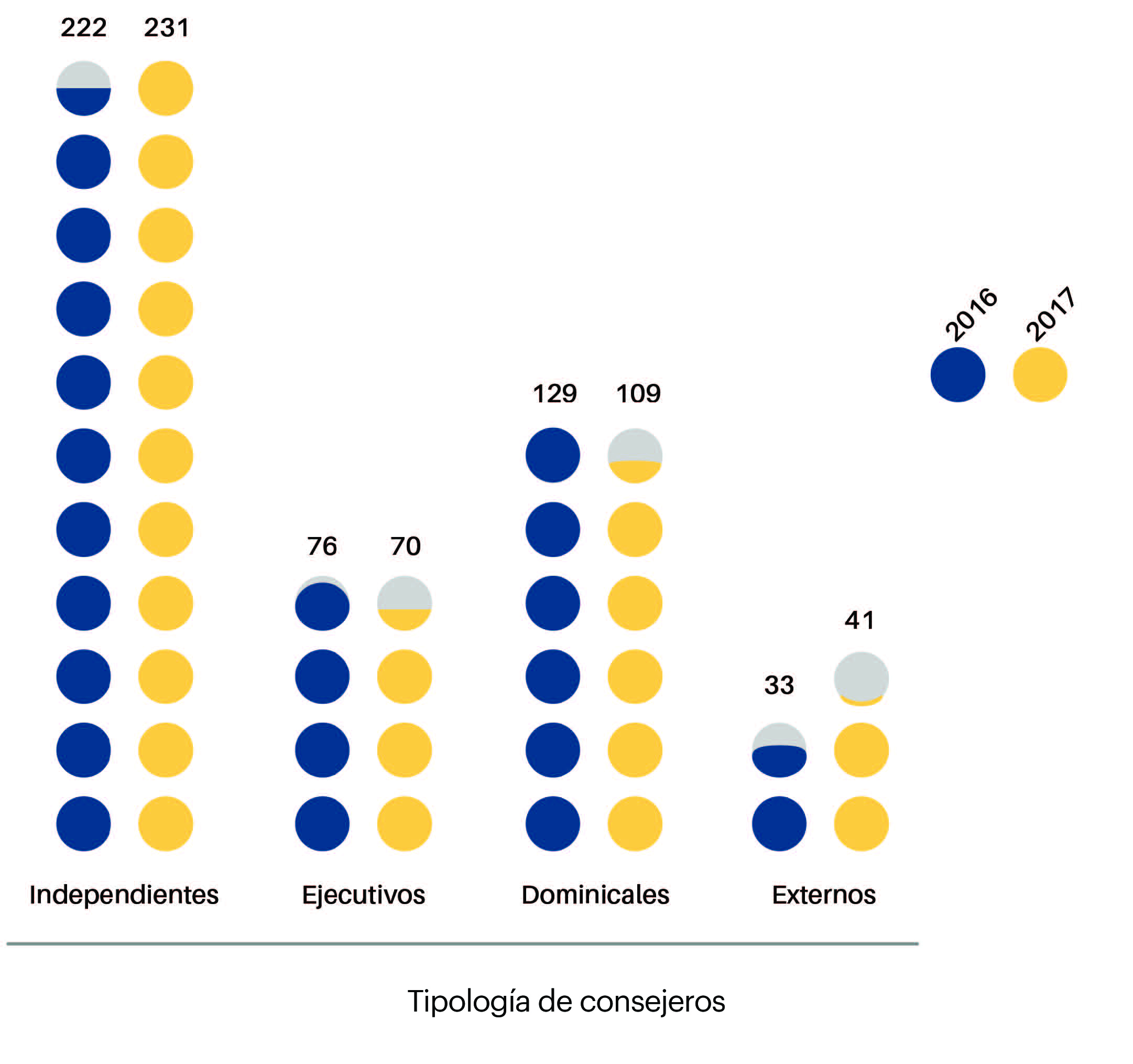 El informe elaborado por el Foro de Buen Gobierno y Accionariado, que lideran el IESE y Atrevia, señala también que a lo largo de 2017 se redujo el número total de consejeros, pasando de 460 a 451. Pero, de nuevo, se trata de un descenso motivado por el cambio de empresas.