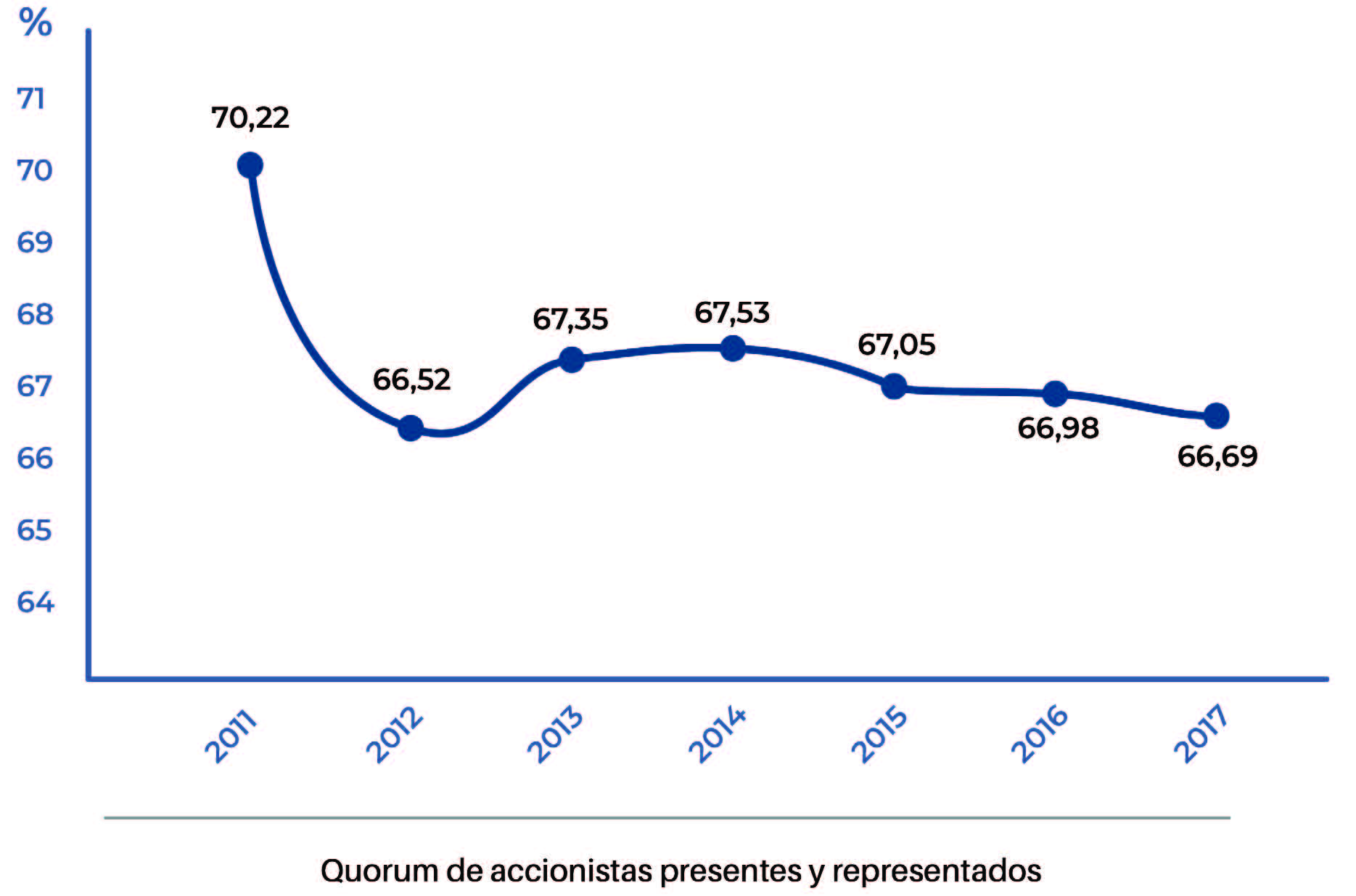 En cuanto a la participación en las juntas generales de accionistas (67%), se mantiene la suave tendencia a la baja iniciada en 2015.