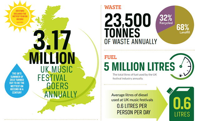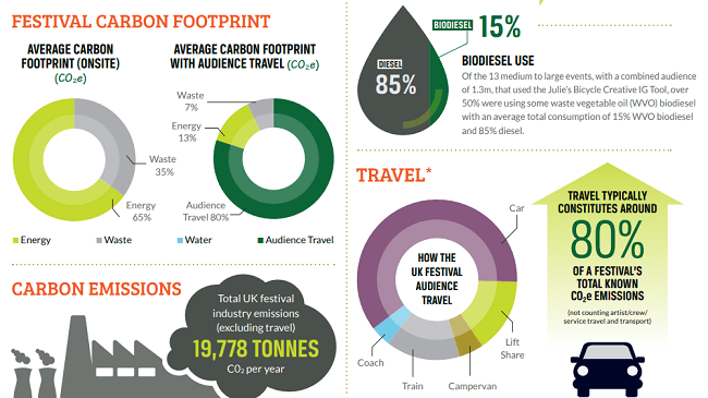 Los conciertos más grandes también significan mayores impactos potenciales. Según un informe de 2015, los 279 festivales de música en Reino Unido son responsables de 20,000 toneladas métricas de emisiones de gases de efecto invernadero cada año: 100,000, incluido el viaje de la audiencia.