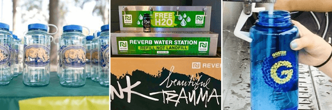 A través de su campaña #RockNRefill, Reverb proporciona agua filtrada gratis y botellas reutilizables de marca mediante donación.