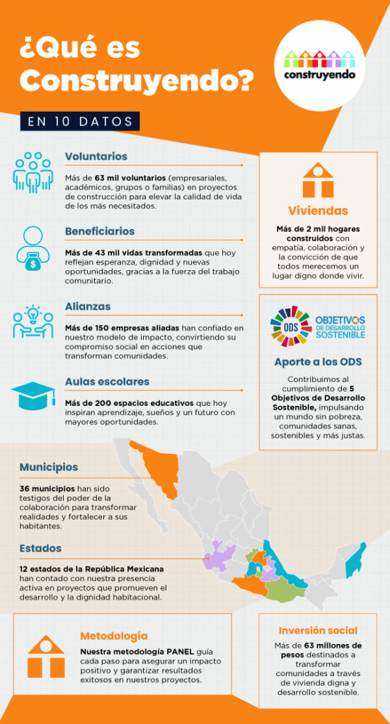 En palabras simples: Construyendo cambia vidas a través de la edificación de viviendas, escuelas y espacios comunitarios. Solo en 2018, en su primer año de operación, lograron construir 447 viviendas, beneficiando a más de 7 mil personas en seis estados de la República Mexicana. Y ese fue solo el inicio.