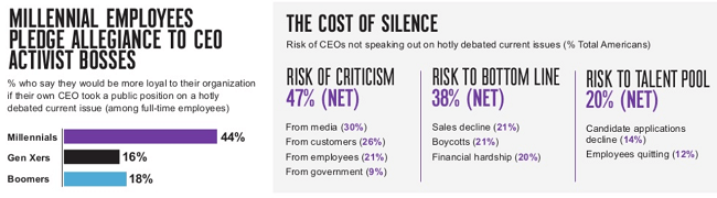 Según la investigación, el 47% de los millennials creen que el CEO tiene la responsabilidad de hablar sobre los problemas que son importantes para la sociedad. Solo el 28% de la Generación X y los baby boomers están de acuerdo. El informe de 2017 también revela que el 51% de los millennials dicen que es más probable que compren productos de una compañía cuyo CEO ha dado su opinión sobre una cuestión social, lo cual es un incremento del 11% respecto del 2016.