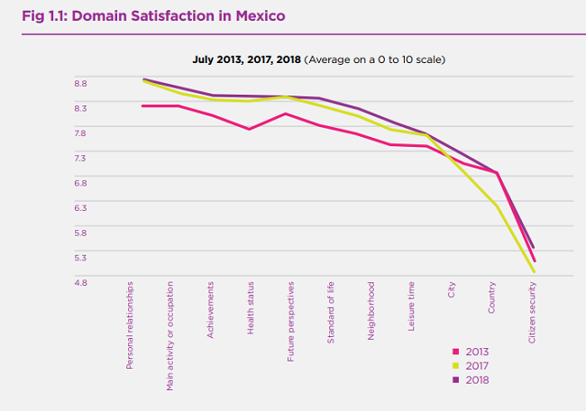 Para los mexicanos, la satisfacción es más alta en las relaciones personales y más baja en la seguridad ciudadana.