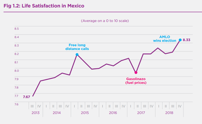 Estos fueron los niveles de satisfacción en México en 12 aspectos de vida, medidos a mediados del año en 2013, 2017 y 2018.
