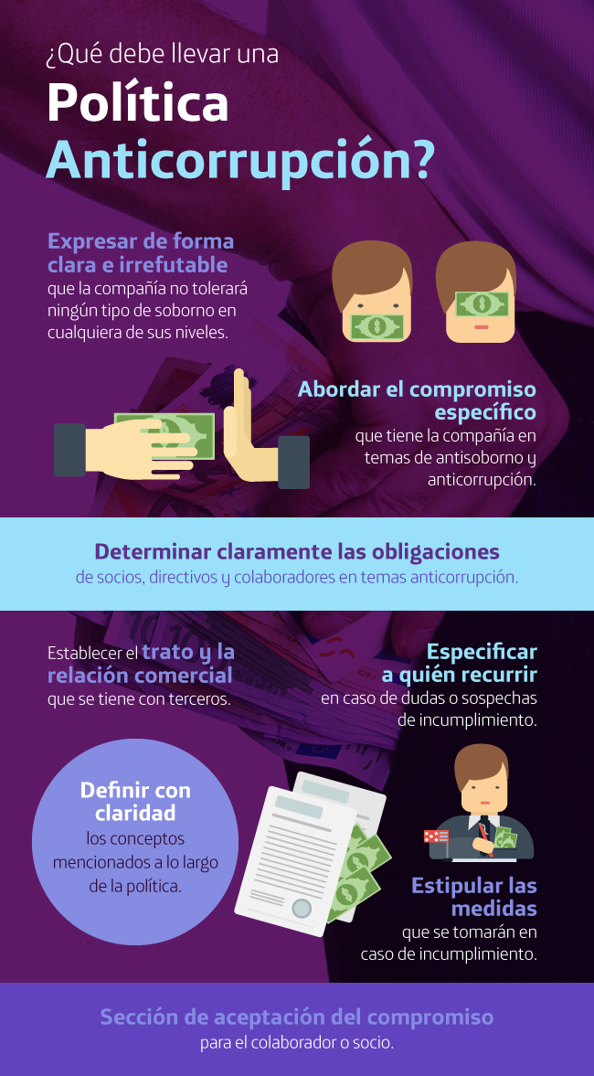 Una política de anticorrupción es un documento que socios y colaboradores deben de firmar y acatar. En este se establecen normas y medidas en caso de estar ante situaciones de soborno, ya sean gubernamentales o comerciales.