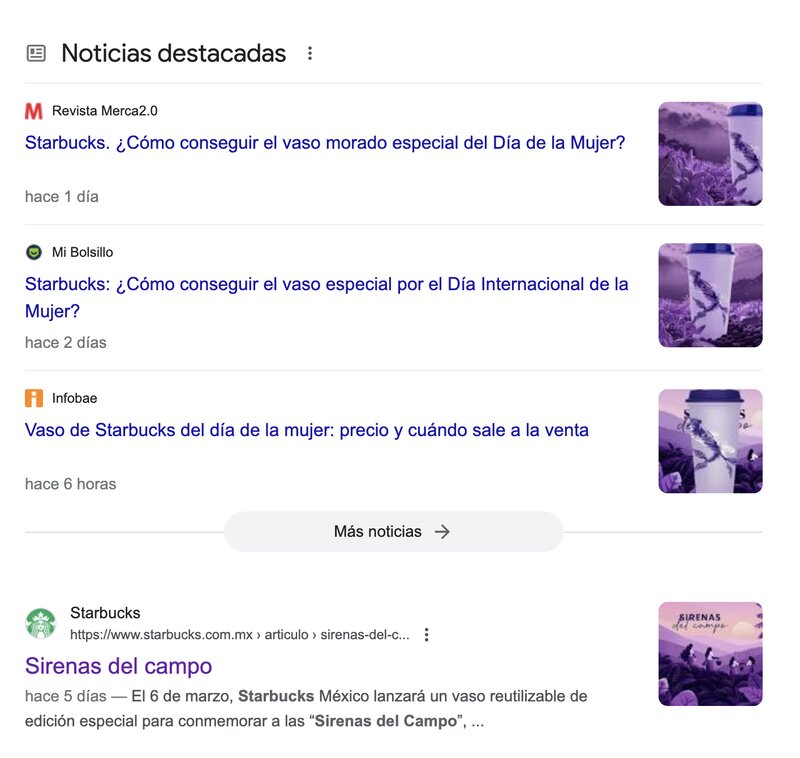 ¿Se logró? Aquí los resultados de búsqueda en Google con el query: Día de la mujer Starbucks. ¡Más que bien para la reputación de marca!