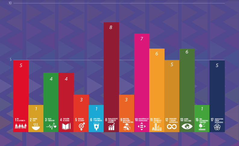 En la gráfica anterior se puede observar que el objetivo número ocho: Trabajo decente y crecimiento económico, destaca como el área en la que se conjunta la mayor cantidad de esfuerzos de estos emprendedores; seguido de la reducción de las desigualdades entre países (ODS 10).