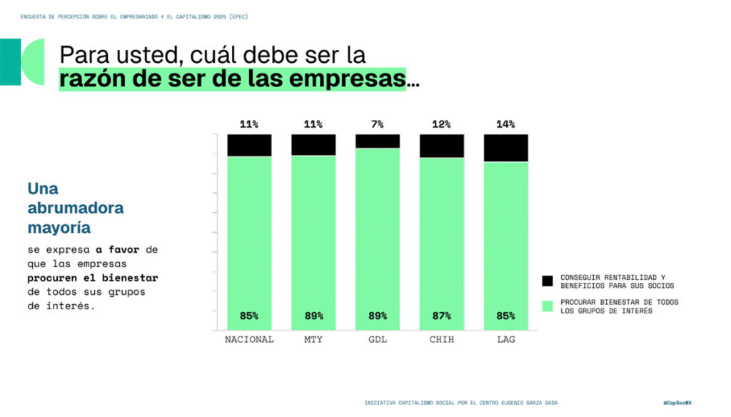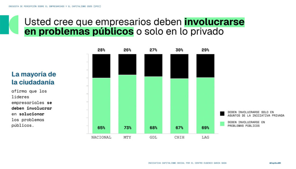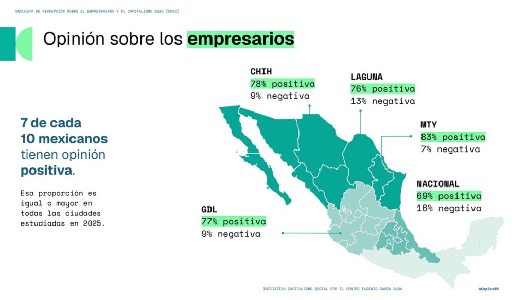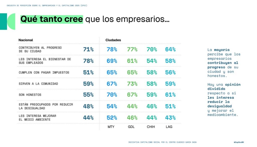 Si bien existe un reconocimiento mayoritario hacia la capacidad de los empresarios para generar empleo y progreso (con una opinión positiva que alcanza el 83% en ciudades como Monterrey), persiste una duda razonable sobre su compromiso real para reducir la desigualdad.