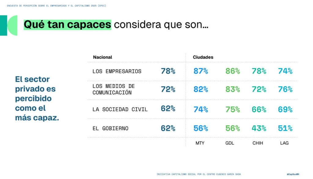 En México, este cambio de paradigma es crucial. La ciudadanía percibe que el sector privado es el más capaz de resolver problemas, superando al gobierno y a la sociedad civil. Sin embargo, la Encuesta de Percepción sobre el Empresariado y el Capitalismo (EPEC) 2025 revela una serie de contrastes profundos en la opinión pública mexicana.