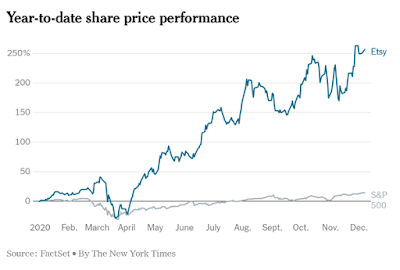 [2] Etsy es un mercado virtual y físico de bienes no industrializados donde se reúnen compradores y vendedores (muchos son artistas apoyados por la empresa. También participan empresas de manufactura que apoyan a los que venden sus productos. Al salir a bolsa tenía 19 millones de compradores por lo menos una vez al año. Ahora tiene casi 40 millones de compradores y 2.1 millones de vendedores activos.