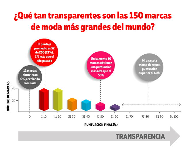 Sin embargo, hay empresas que avanzan hacia una mayor transparencia. De las 98 marcas y minoristas revisados en 2017, se ha notado un aumento promedio del 5% en su nivel de transparencia en 2018.