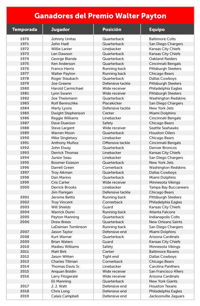 El Premio Walter Payton se entrega de manera anual por la NFL al jugador que muestra un servicio constante con sus comunidades y un excelente desempeño en el terreno de juego.