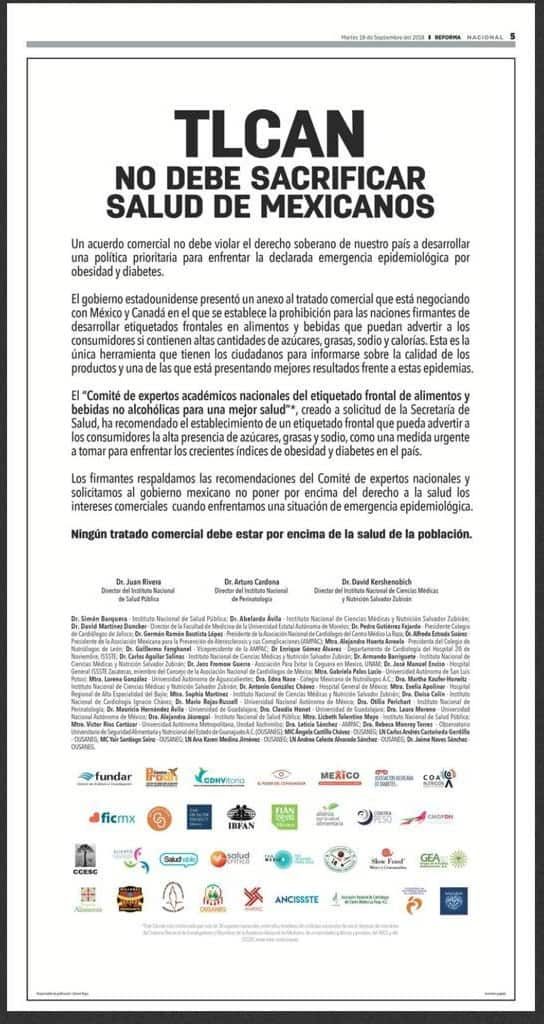 Organizaciones no gubernamentales y especialistas mostraron rechazo en el TLCAN en el cual prohíbe el etiquetado frontal en alimentos y bebidas.