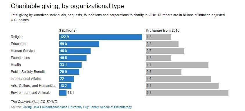 Según Giving USA , el principal informe anual de filantropía en Estados Unidos, las contribuciones religiosas representaron el 32 por ciento de todas las donaciones en Estados Unidos en 2016.
