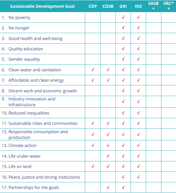 El reporte continúa explicando qué marcos de informes corporativos incluyen cada uno de los ODS en su metodología, y aconsejan a las empresas que elijan un marco basado en los ODS con mayor probabilidad de afectar su desempeño financiero, o aquellos en los que podrían generar el impacto más positivo.
