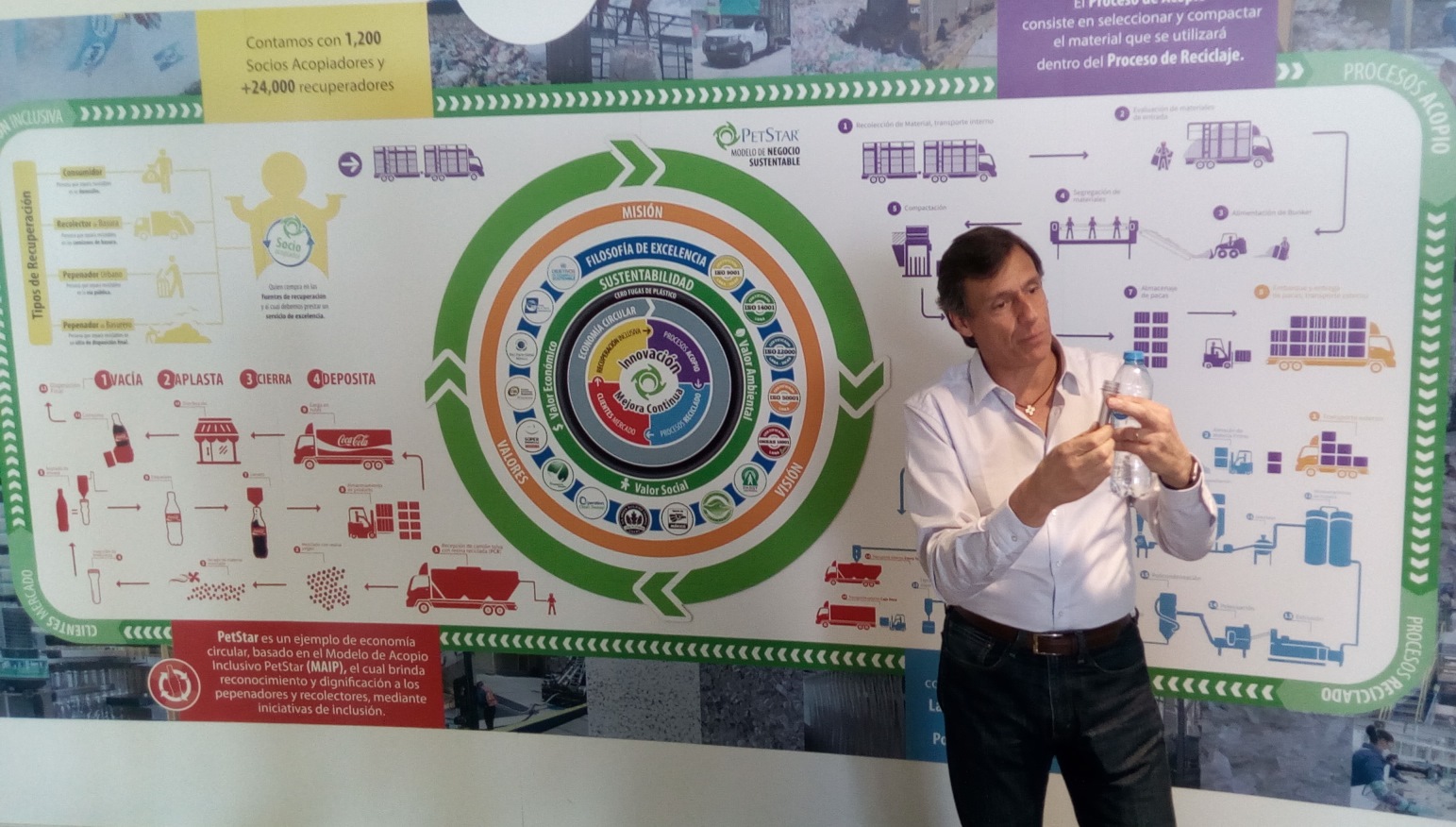 Resaltó la labor desempeñada por la planta de reciclado PetStar, que cada año transforma 120 mil toneladas de PET para obtener 85 mil toneladas de resina virgen que se vuelven a reintegrar en botellas nuevas.