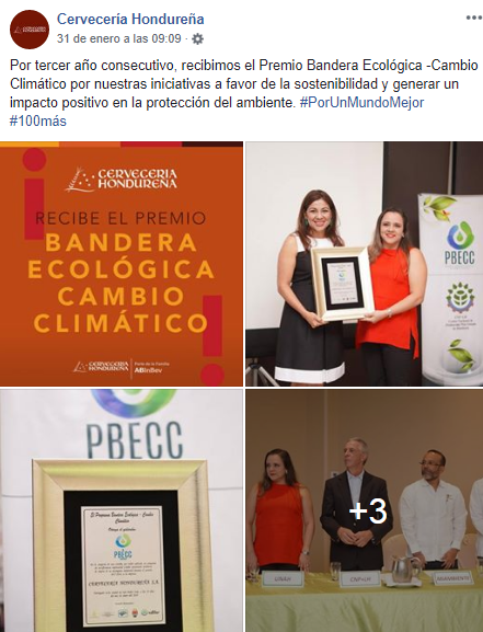 En el caso de Cervecería Hondureña, una empresa miembro de AB InBev, se reconoció su compromiso para cumplir sus objetivos ara 2025 que abarcan: Gestión del Agua, Empaque Circular, Acción Climática y Agricultura Inteligente y están alineadas con los Objetivos de Desarrollo Sostenible 2030 y el Acuerdo de París sobre el Cambio Climático de la Organización de las Naciones Unidas.