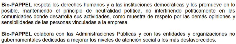 El Código de Ética de Bio Pappel establece que la empresa respeta las instituciones democráticas “manteniendo el principio de neutralidad política, no interfiriendo políticamente en las comunidades donde desarrolla sus actividades”.