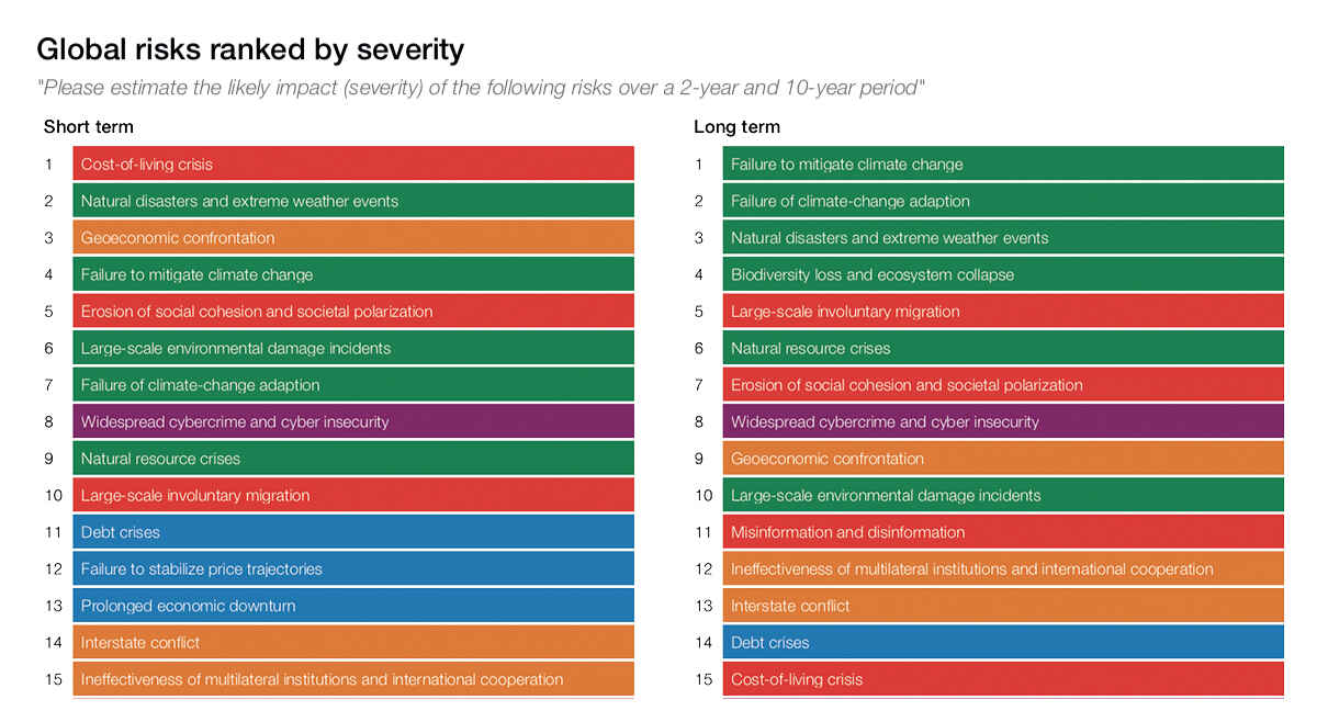 Los Riesgos Globales 2023 se enumeran por orden de gravedad. Click para ampliar.