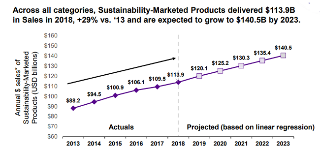 En todas las categorías, los productos sostenibles entregaron 113.9 billones de dólares en ventas en 2018, + 29% en comparación con ‘2013 y se espera que crezcan a 140.5 billones de dólares para 2023.