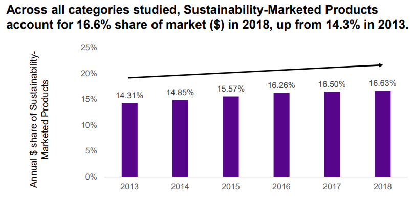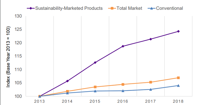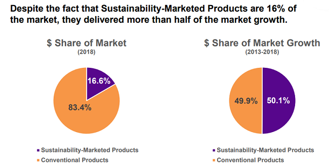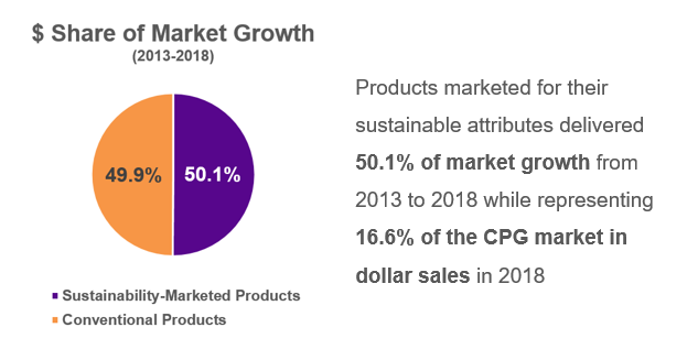 La investigación llevada a cabo por el Centro para Negocios Sostenibles encontró que los productos comercializados en sostenibilidad entregaron el 50.1 por ciento del crecimiento del mercado de 2013-2018, mientras representaban el 16.6 por ciento del mercado de CPG en ventas en dólares en 2018.