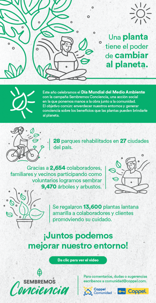 “En Coppel Comunidad estamos comprometidos con el cuidado del medio ambiente, por lo que seguiremos sembrando conciencia acerca de su importancia y cuidado, además de promover la participación responsable de la sociedad en este tema”, aseguró Rocío Guerrero, Directora de Coppel Comunidad, a través de un comunicado.