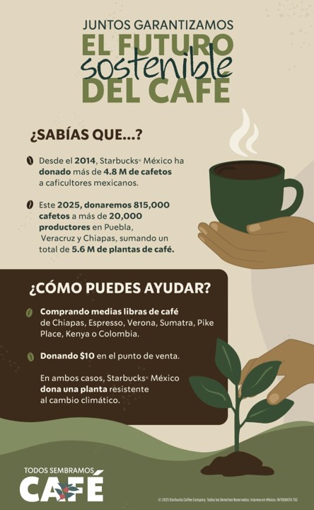 Del 23 de junio al 4 de agosto, por cada bolsa de café en grano entero comprada en tienda o a través de plataformas digitales, Starbucks México donará una planta de café resistente a la roya. Los clientes también pueden realizar una donación voluntaria de $10 MXN al momento de pagar o a través de la app Starbucks Rewards®.