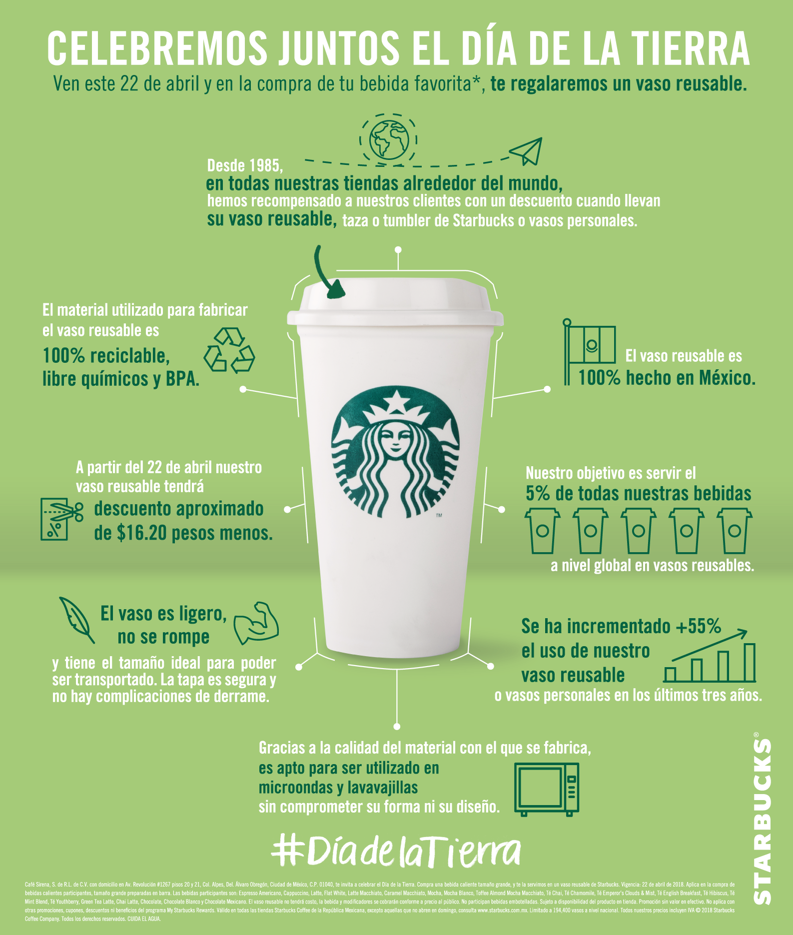 Este 22 de abril, Starbucks obsequiará a todos su clientes en México un vaso reusable en la compra de bebidas calientes grandes preparadas en barra: Espresso Americano, Cappuccino, Latte, Flat White, Latte Macchiato, Caramel Macchiato, Mocha, Mocha Blanco, Toffee Almond Mocha Macchiato, Té Chai, Té Chamomile, Té Emperor’s Clouds & Mist, Té English Breakfast, Té Hibiscus, Té Mint Blend, Té Youthberry, Green Tea Latte, Chai Latte, Chocolate, Chocolate Blanco y Chocolate Mexicano.
