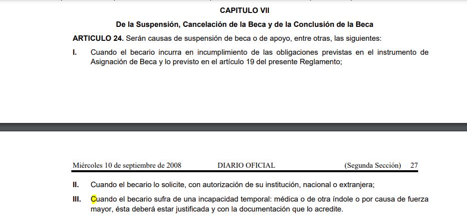En cuanto a esto, refiere como una causa de suspensión Becas Conacyt, la incapacidad temporal, ya sea por razones médicas o por algún evento de fuerza mayor que esté justificado, por lo que quien se encuentre en esta situación puede pausar su beca sin perderla.