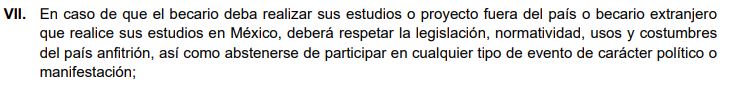 Ya que al acceder al apoyo se compromete a cumplir lo estipulado en el Artículo 19 que establece que los becarios nacionales en estancias en el extranjero, así como los internacionales radicados en México deberán de “abstenerse de participar en cualquier tipo de evento de carácter político o manifestación”.