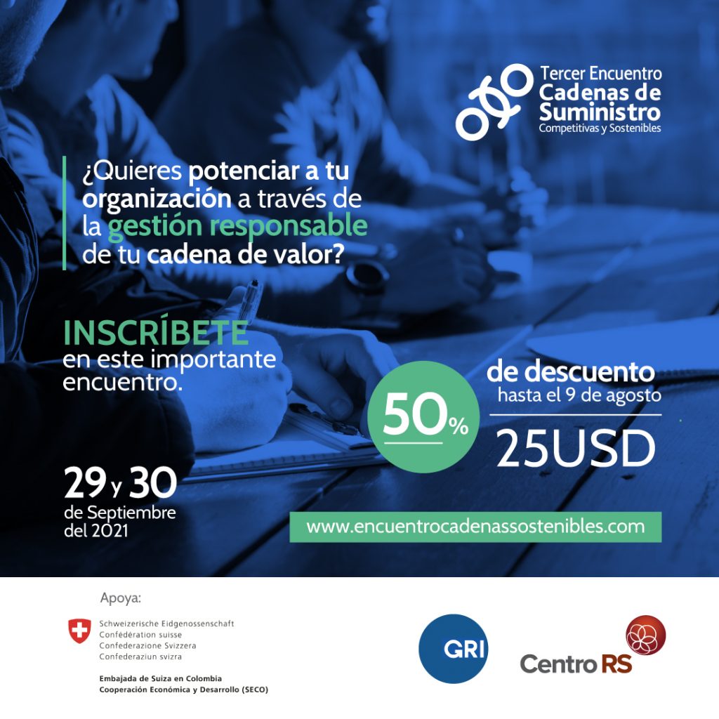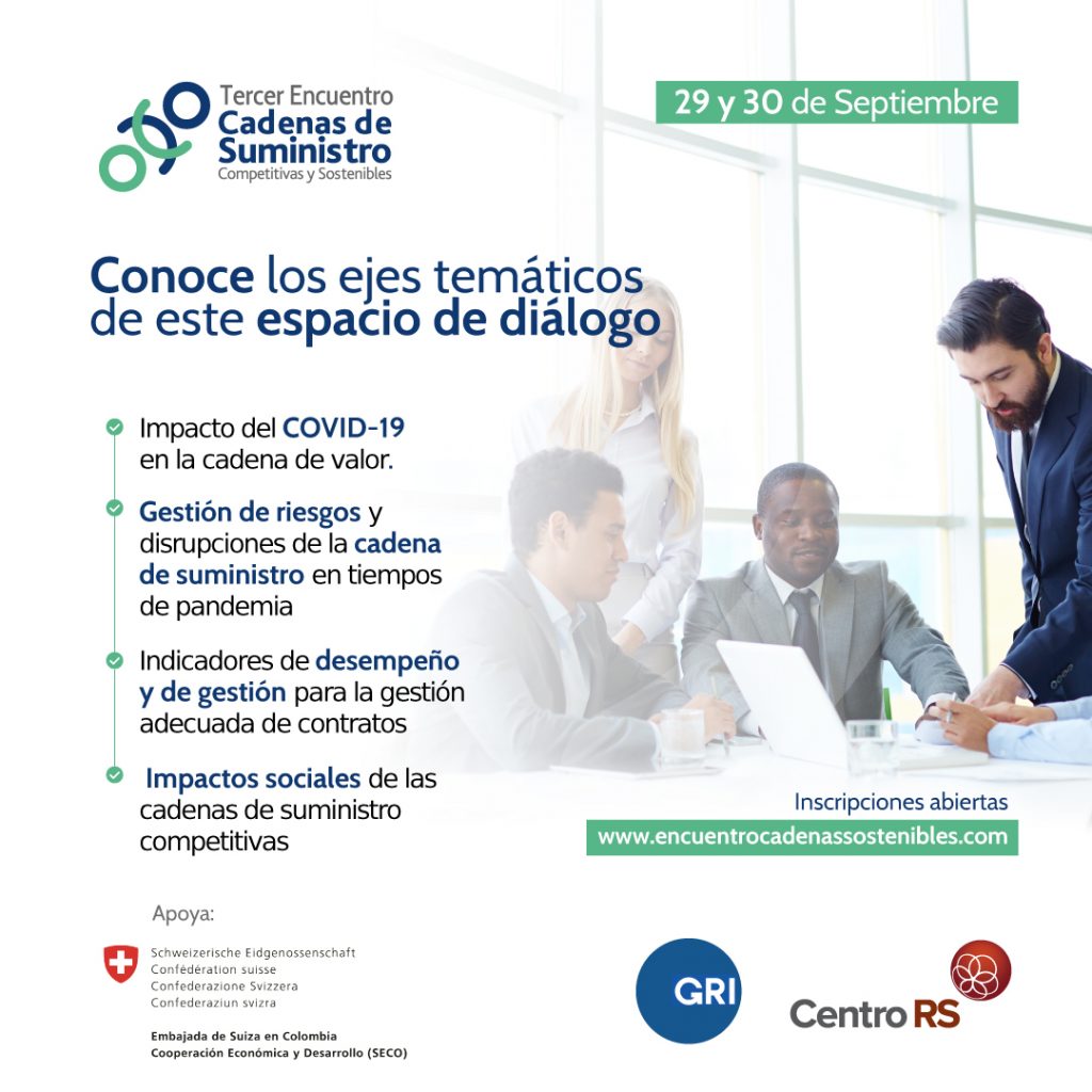 El Global Reporting Initiative -GRI-, en alianza con el Centro Internacional de Responsabilidad Social -Centro RS-, y el apoyo de la Embaja de Suiza en Colombia -SECO-, llevarán a cabo la Tercera Edición del Encuentro de Cadenas de Suministro Competitivas y Sostenibles el próximo 29 y 30 de septiembre.